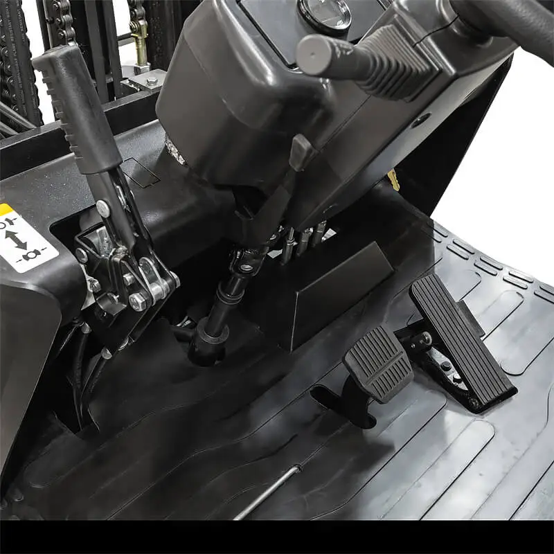 Управление дизельным вилочным погрузчиком организовано таким образом, чтобы оператор мог одновременно контролировать движение машины и работу грузоподъемного механизма. Рабочее место включает рулевое колесо, педали управления и рычаги гидравлики.