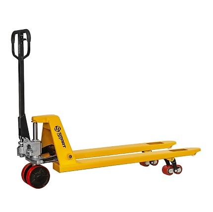 Конструкция крепления сдвоенных роликов допускает движение по покрытию с небольшими неровностями, дополнительный ролик на конце вил предусмотрен для поперечной погрузки. Во избежание выхода из строя гидроузла и деформации вил роклу не рекомендуется перегружать и использовать для перевозки паллет по наклонным поверхностям.