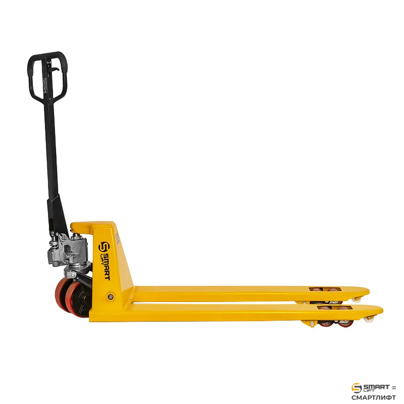 Тележка СМАРТЛИФТ (SMARTLIFT) SD (CBY-BF3.0) PDP оснащена полиуретановыми колесами увеличенного диаметра 180 мм и сдвоенными (тандемными) полиуретановыми роликами, что обеспечивает максимально комфортное передвижение тележки по ровным (наливным) полам. Конструкция крепления сдвоенных роликов позволяет легко преодолевать небольшие неровности, а наличие дополнительного ролика на конце вил делает удобной работу с паллетами поперёк. Для управления тележкой используется обрезиненная эргономичная рукоять с трехпозиционным рычагом.
